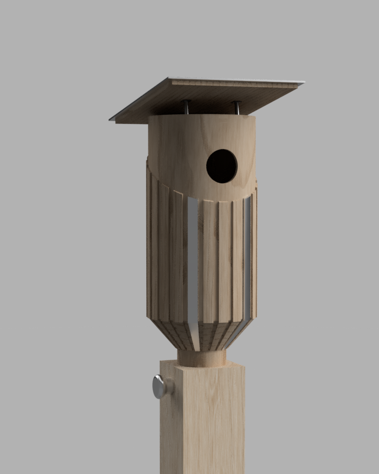 This rendering would be used to first experiment with different looks of the birdhouse, such as having panels or not, or different shaped roofs.