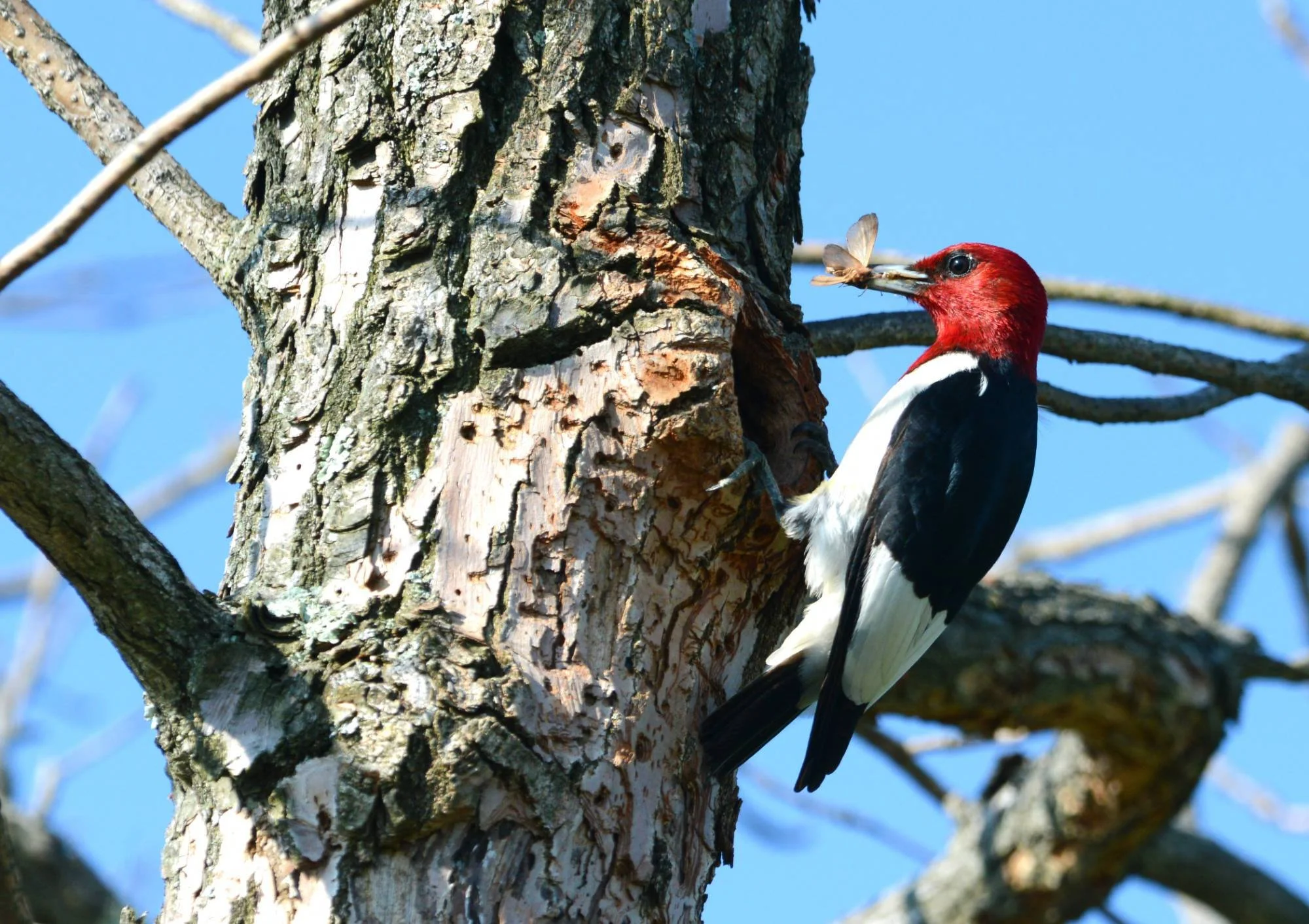 The Red Headed Woodpecker has special habits when it comes to its nest. Typically it makes its nest in trees as it physically carves out a hollow, or it will choose a previously made hollow, or a birdhouse.
