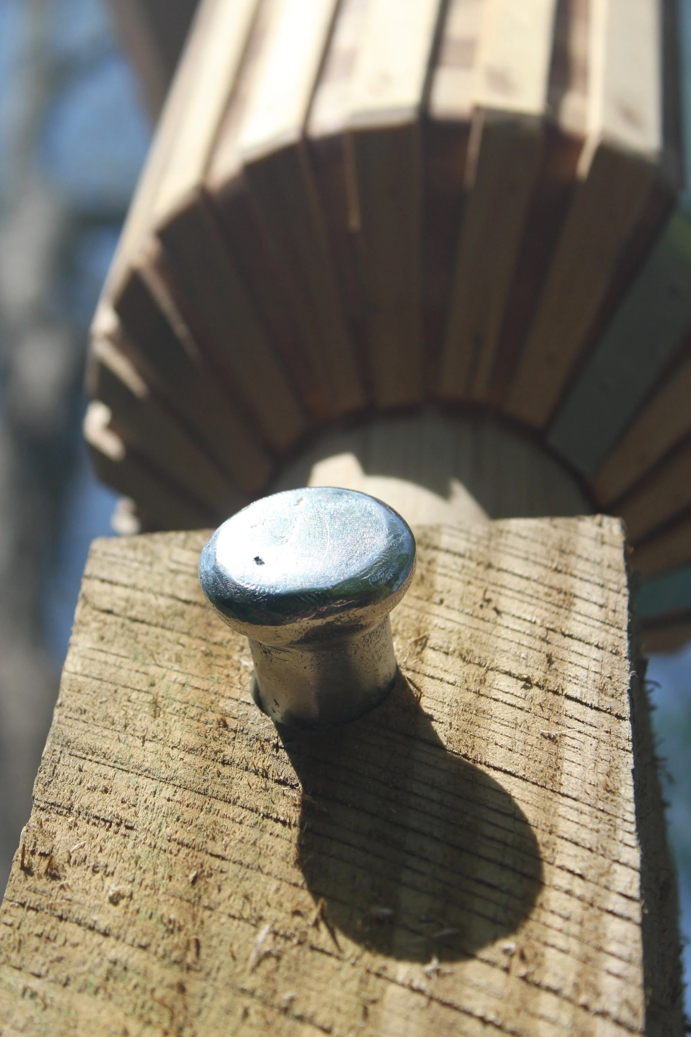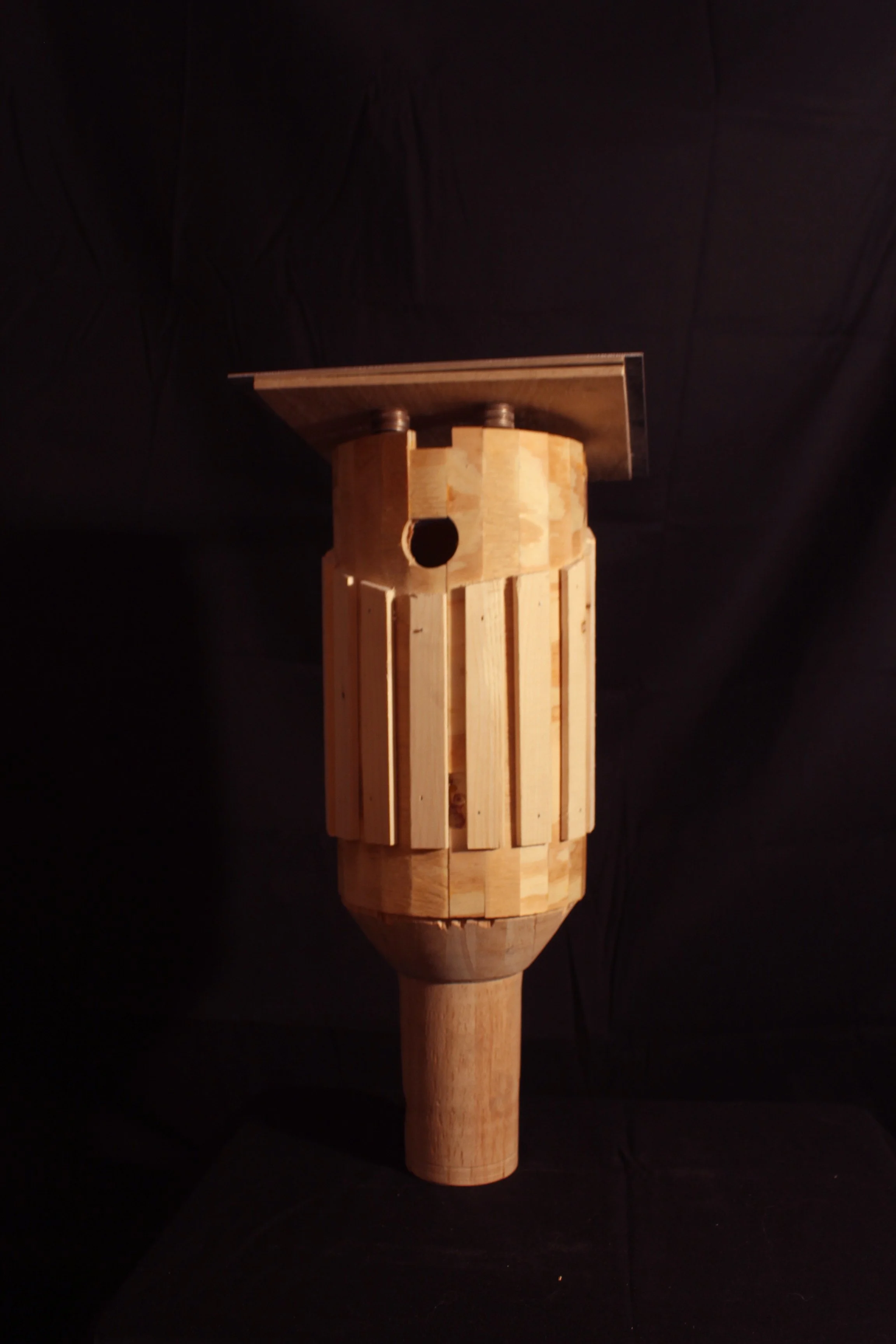 The production of this process was a new one to me, consisting of previous knowledge of woodworking, and the brand new technique of metal casting this project was challenging to make. This birdhouse consists of 16 rings laminate stacked together to give the opposing grain look. In combination with a lathe turned maple base and a aluminum sheet roof, this piece is able to withstand most weather.