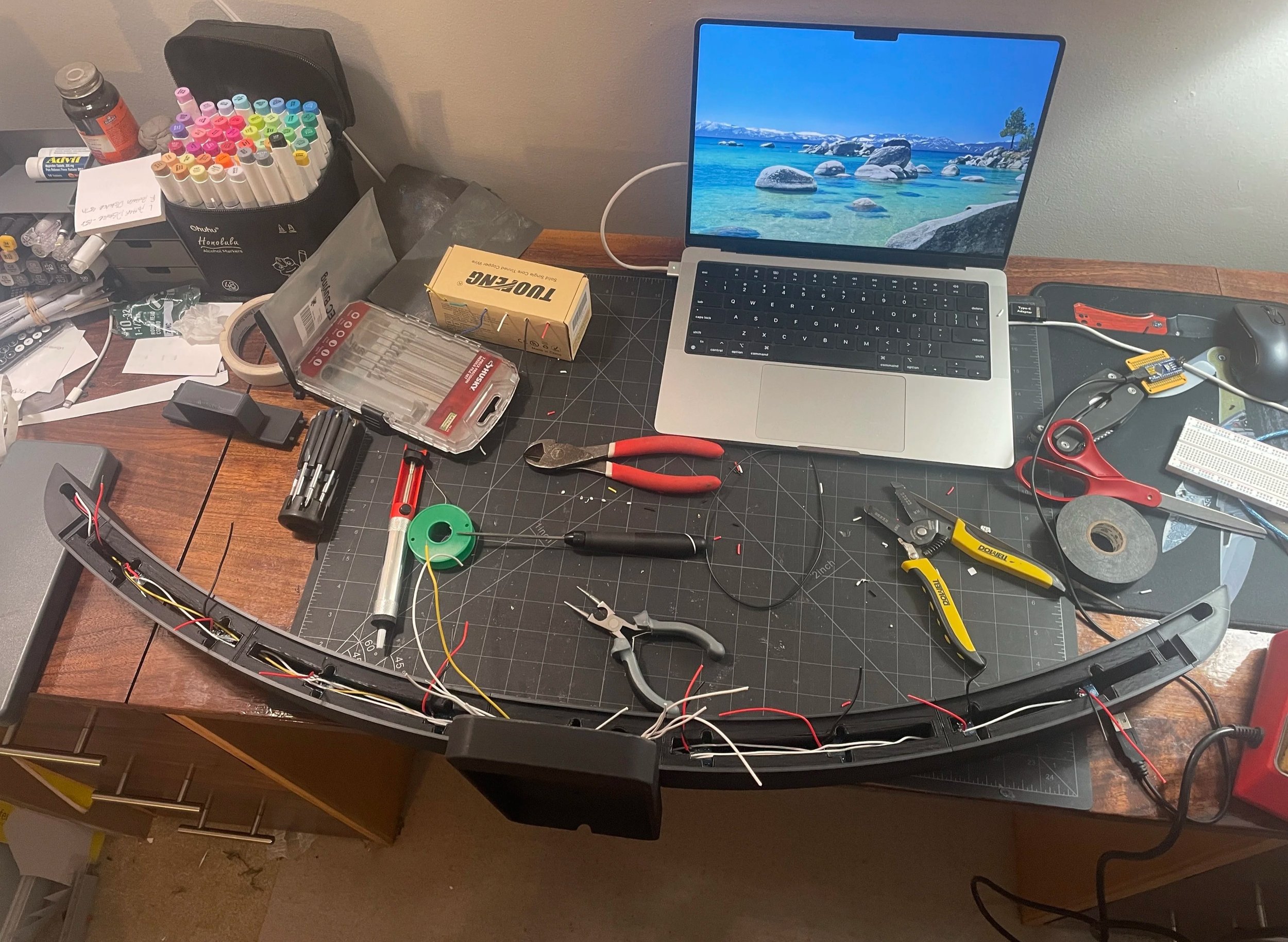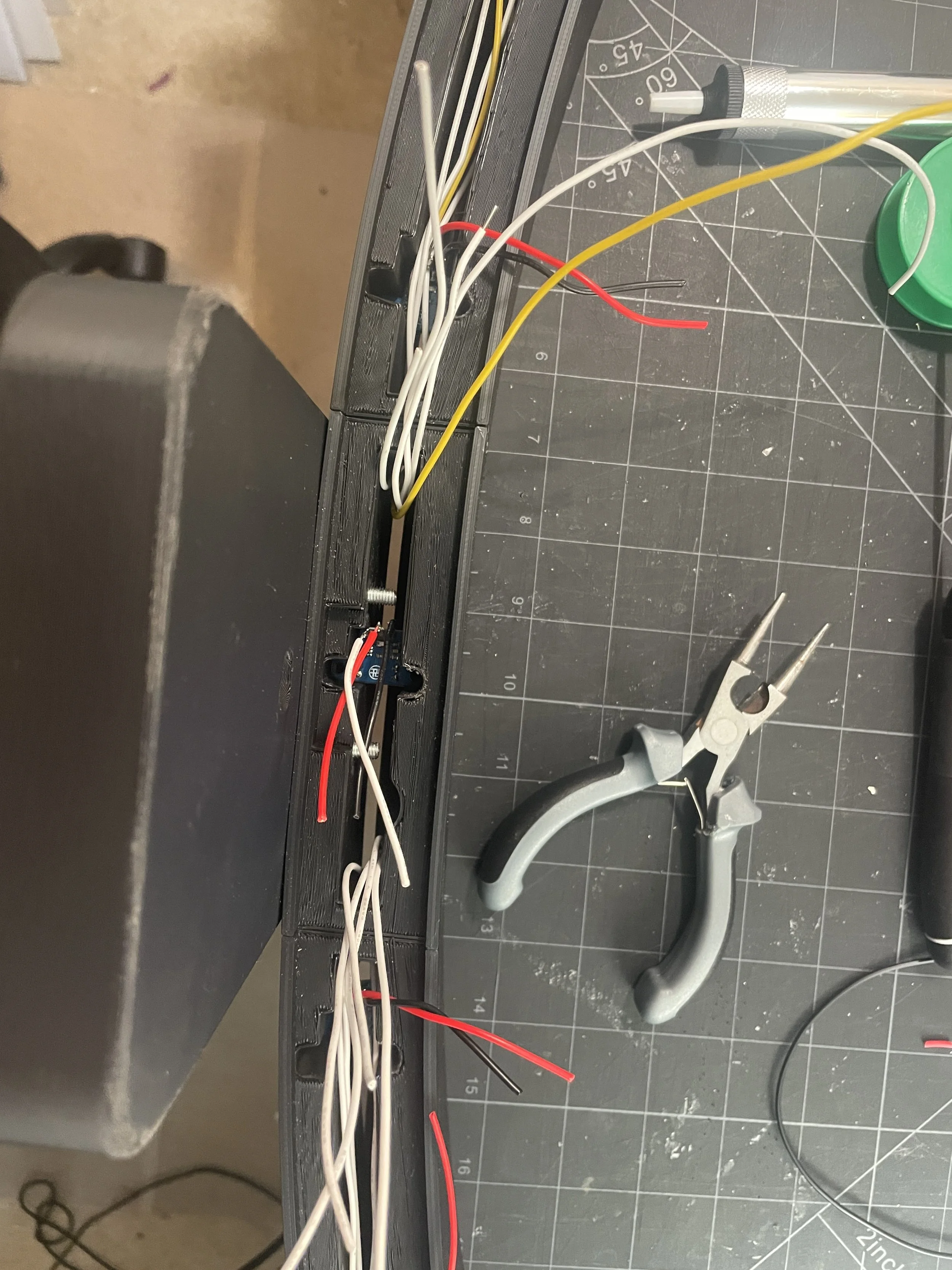 The process involved in making the final prototype involved around 12 hours of 3d printing, including several test prints to make sure pieces fit together, Glueing the 14 parts of the main body together, installing the backing, installing the mount, and finally installing all the wiring to each sensor and the light strip. Each sensor has three pins, one for power, one for ground, and one to the designated spot on the Arduino Nano.