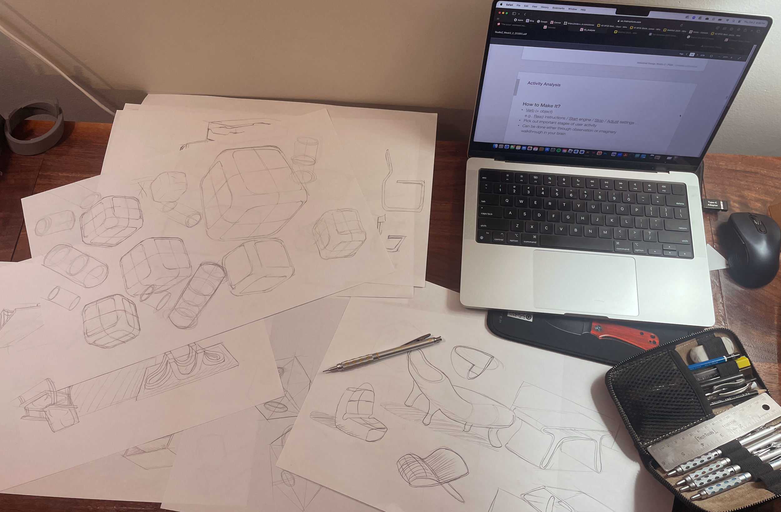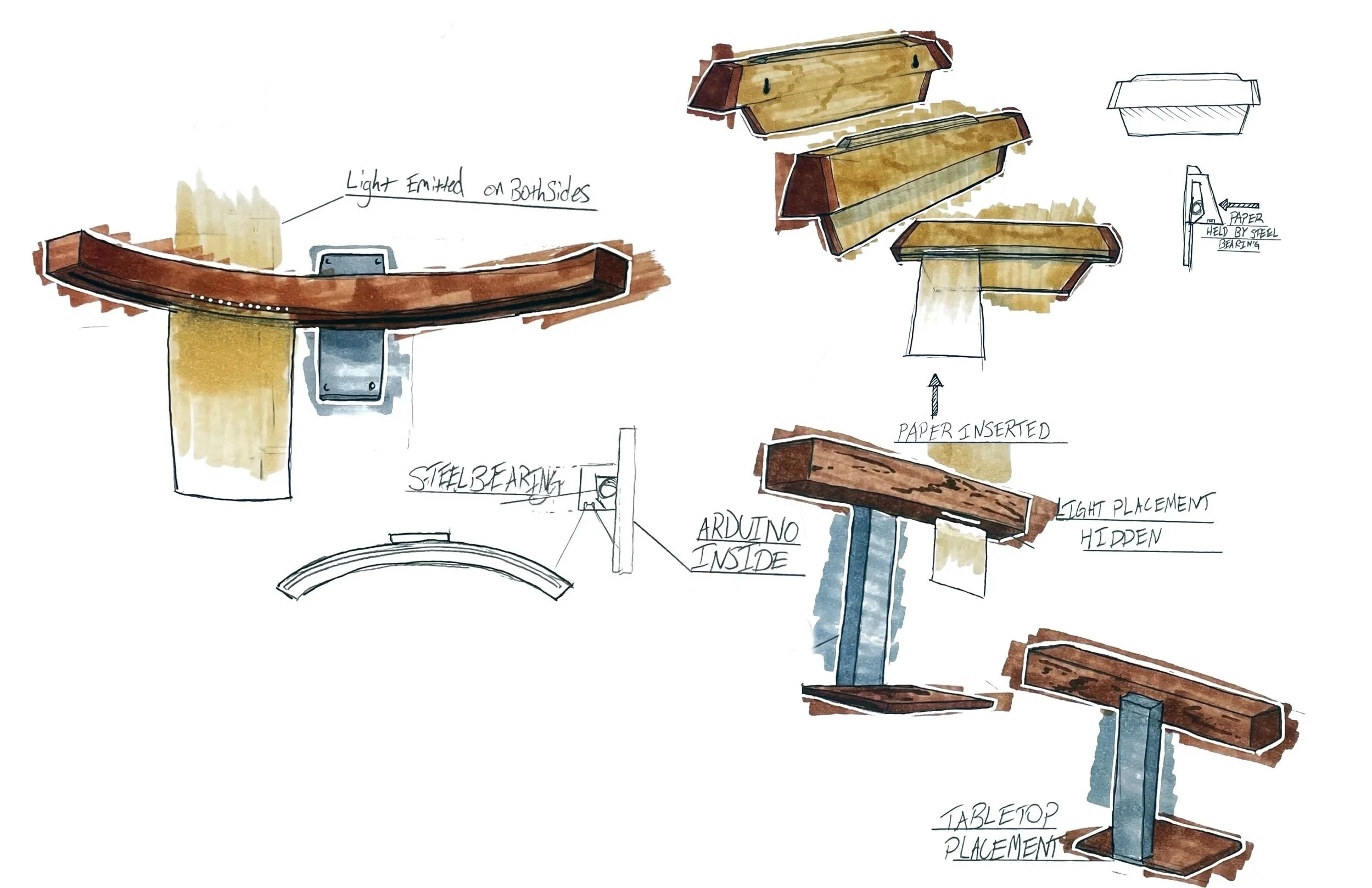 These fast drawn sketches allowed me to see how the user would be able to change the design by using the product. These would further the design of the product by allowing for more possibilities such as light placement, placement of the product itself, and where and how the user would interact with it.