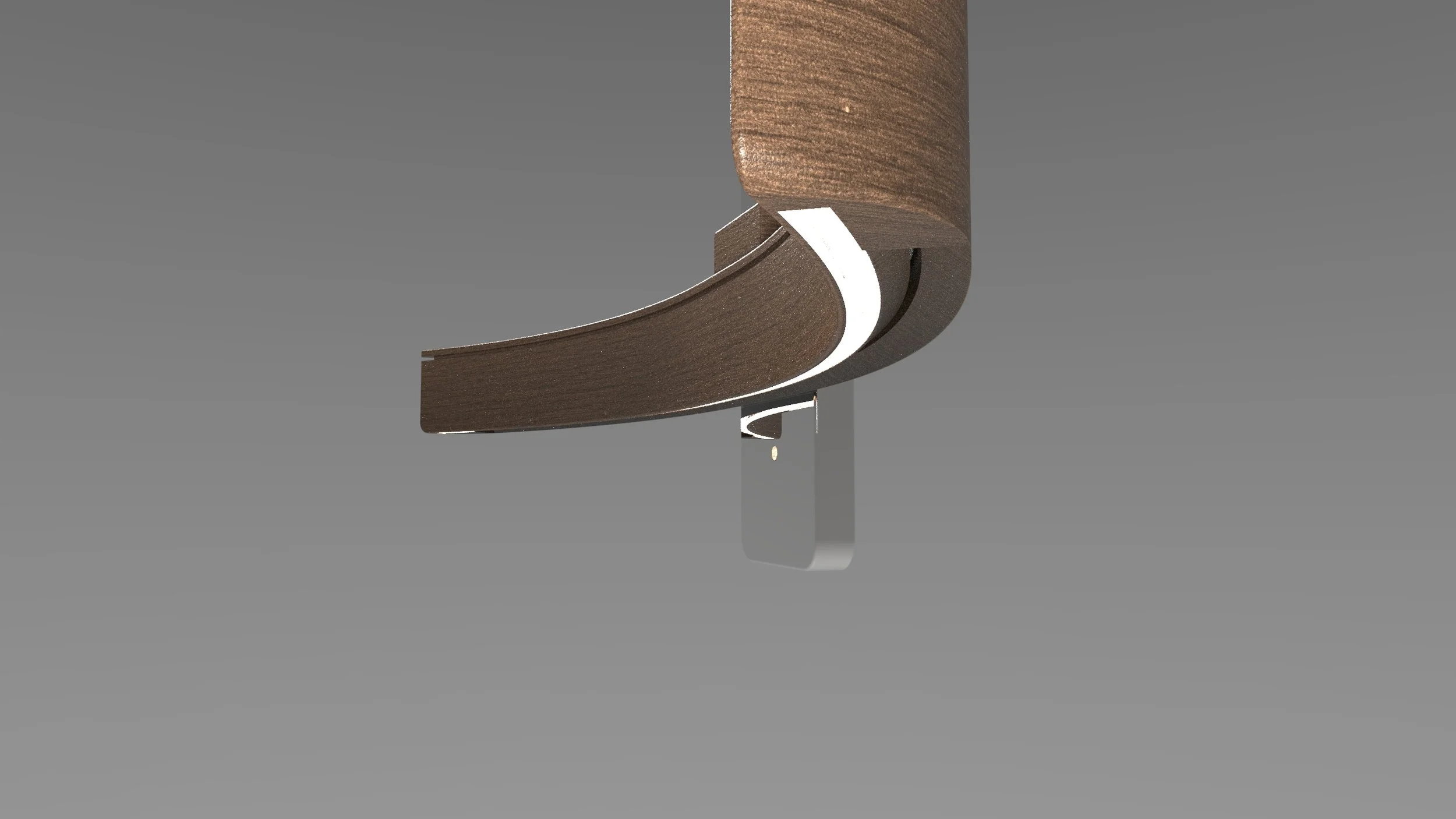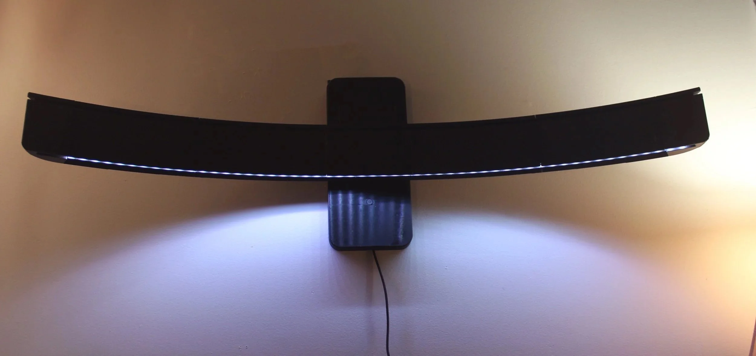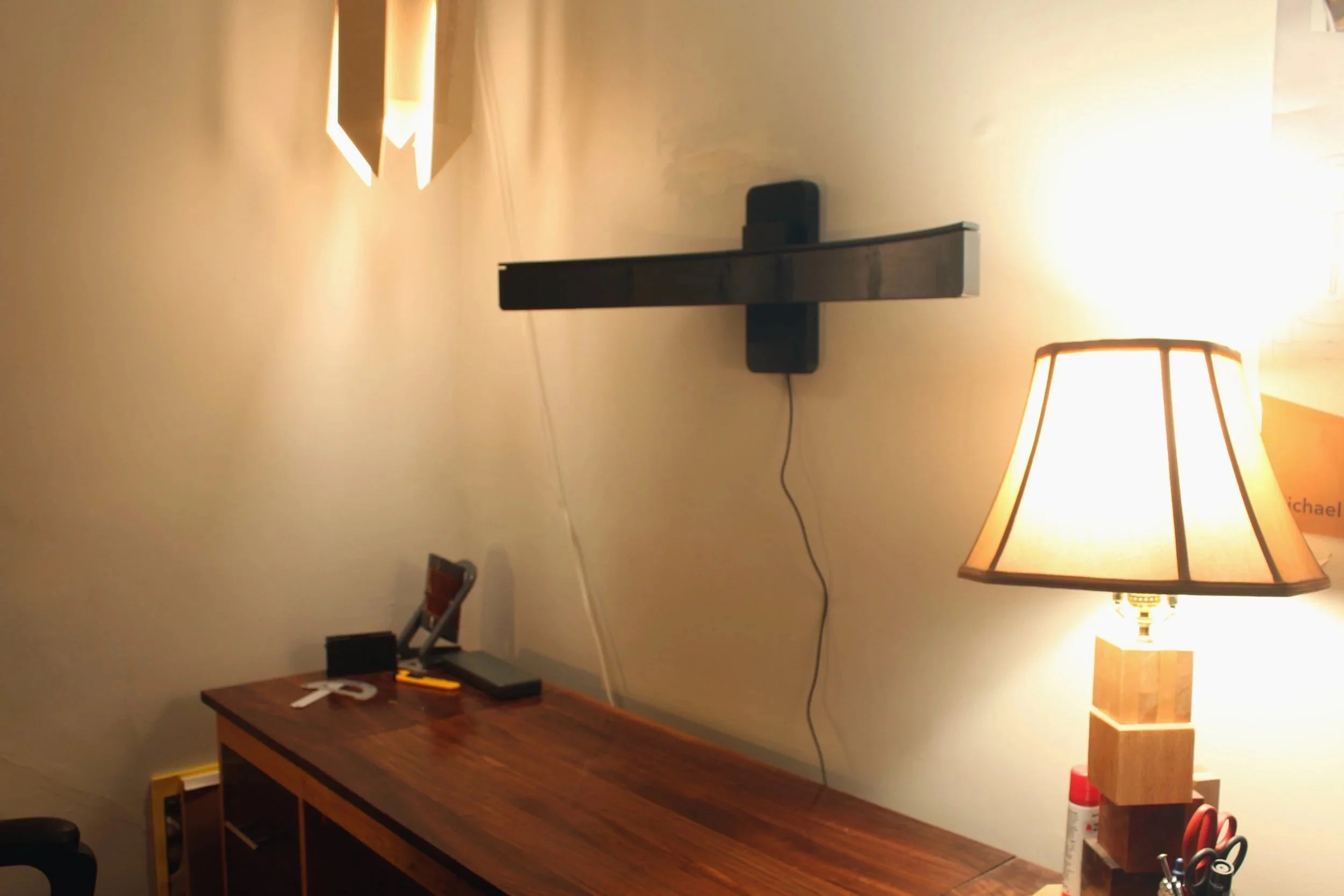 This design features a main wooded, stack laminate body that curves to better show work when seated at a desk, housing 9 IR break beam sensors, an Arduino Nano for control, and 55 steel ball bearings to firmly hold the paper. In addition, a metal bracket that houses the button to turn on and off the lights, a French cleat to mount it to a wall, and serves as the main mount to the body.