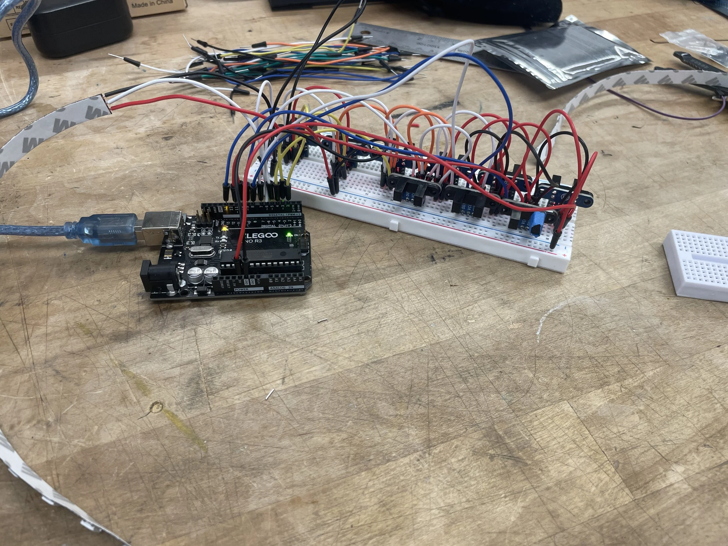 These models are used to show how the code works and to plan to integrate properly. This model features 9 IR break beam sensors, as well as a button that are all wired to a Arduino Nano that runs