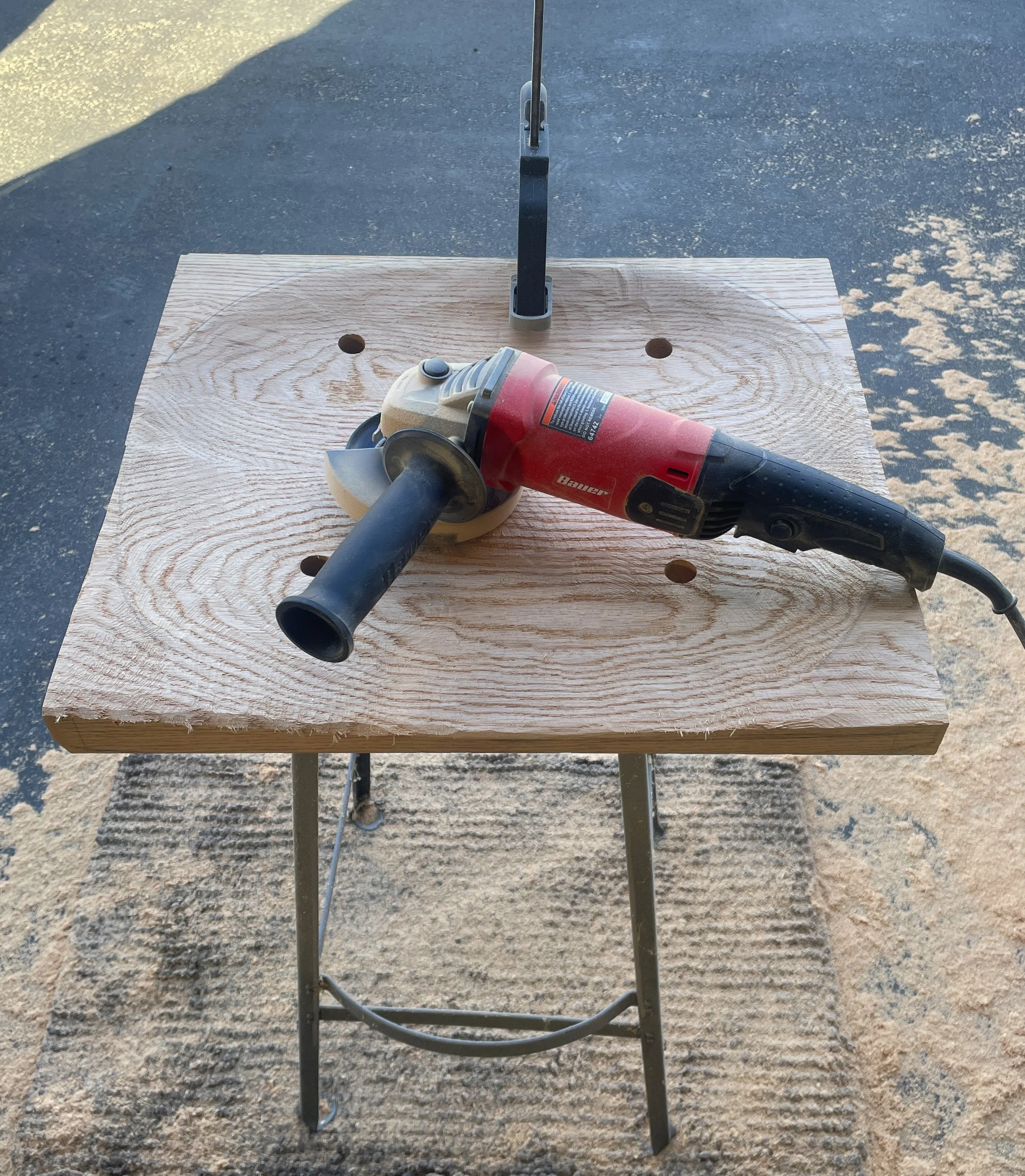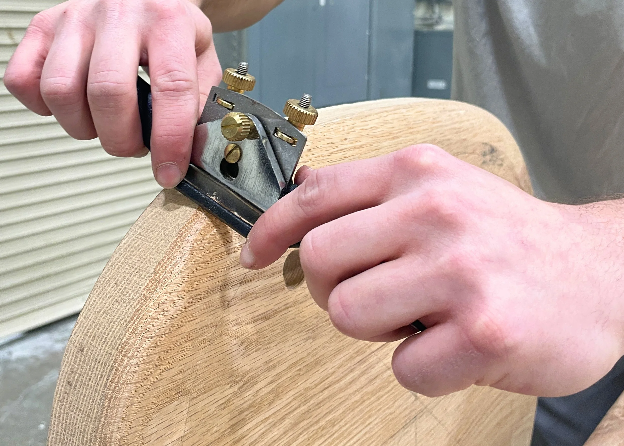 The seat was constructed completely by hand consisting first of making the mortises. these were done by using ramps set at different angles of 11 and 14 degrees from 90 giving the back legs a more dramatic angle then the ones in the front. The bowl of the seat was done with an angle grinder with a shaping wheel. This would have normally been done with a CNC, however, due to project restraints, was done by hand. The fillet on the bottom was done using a flat bottomed spoke shave.