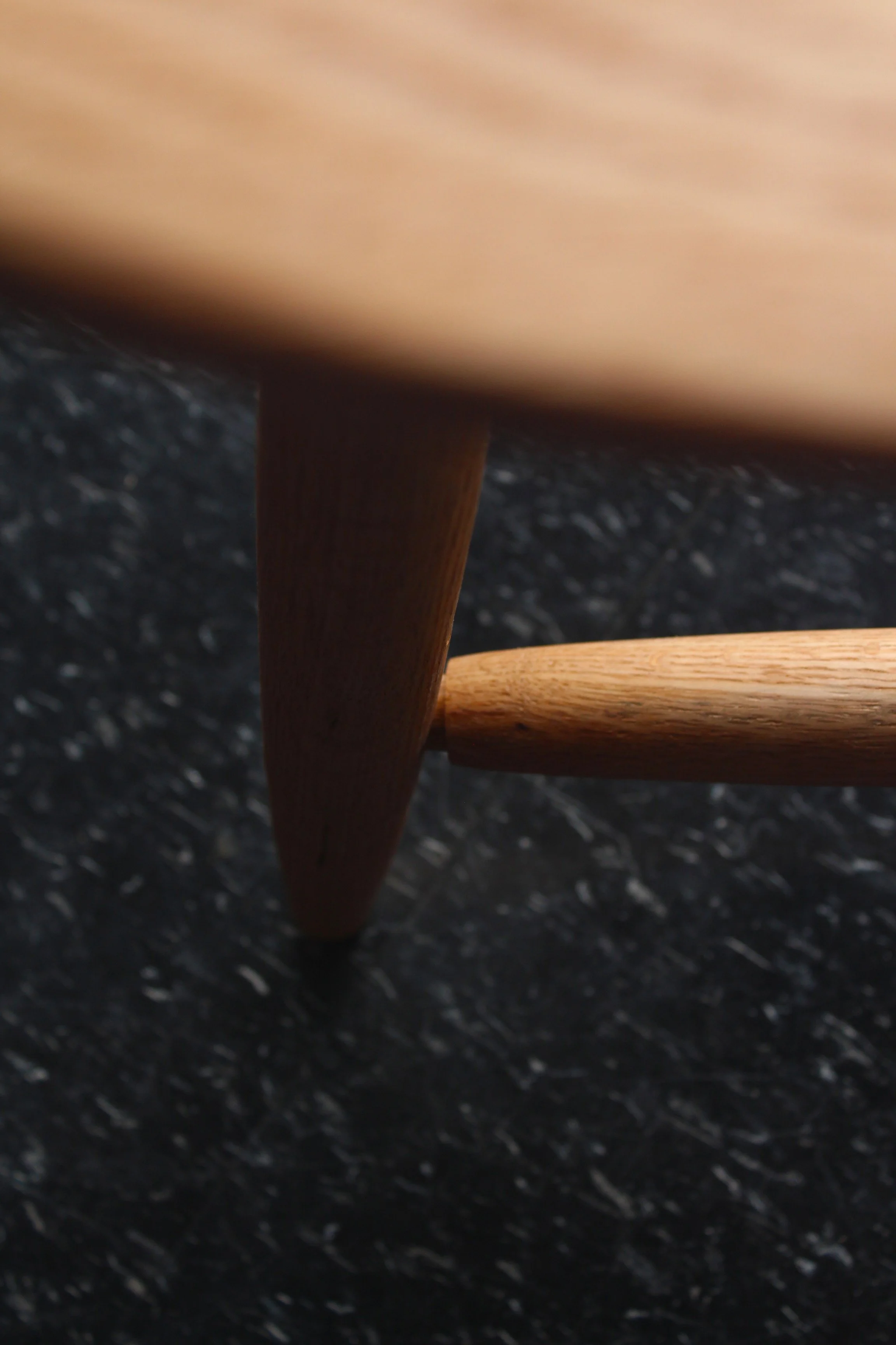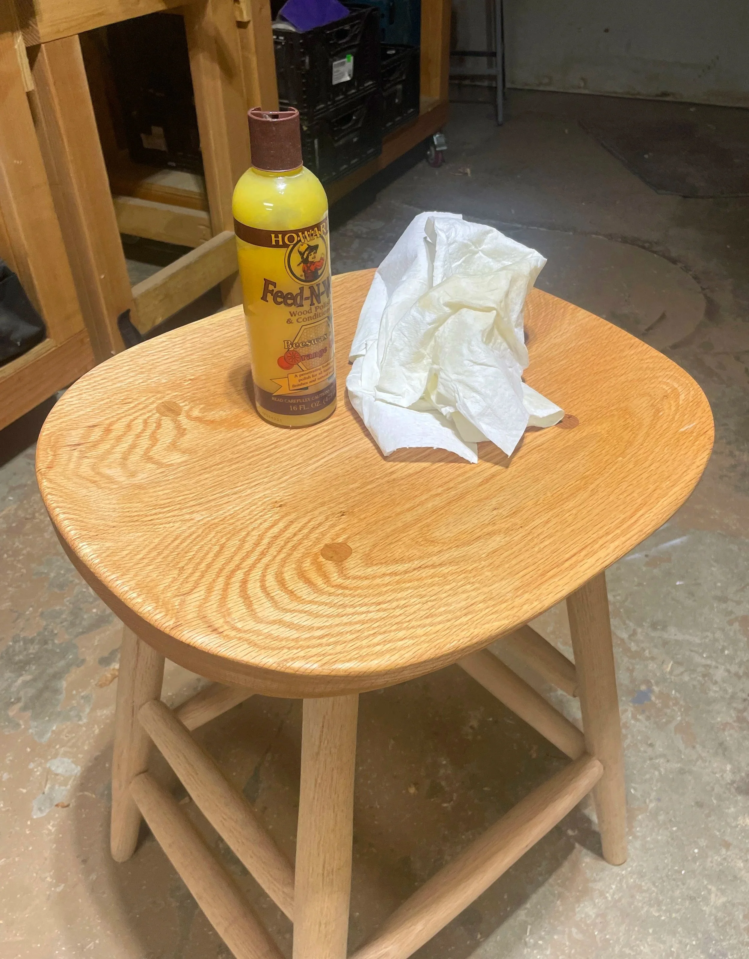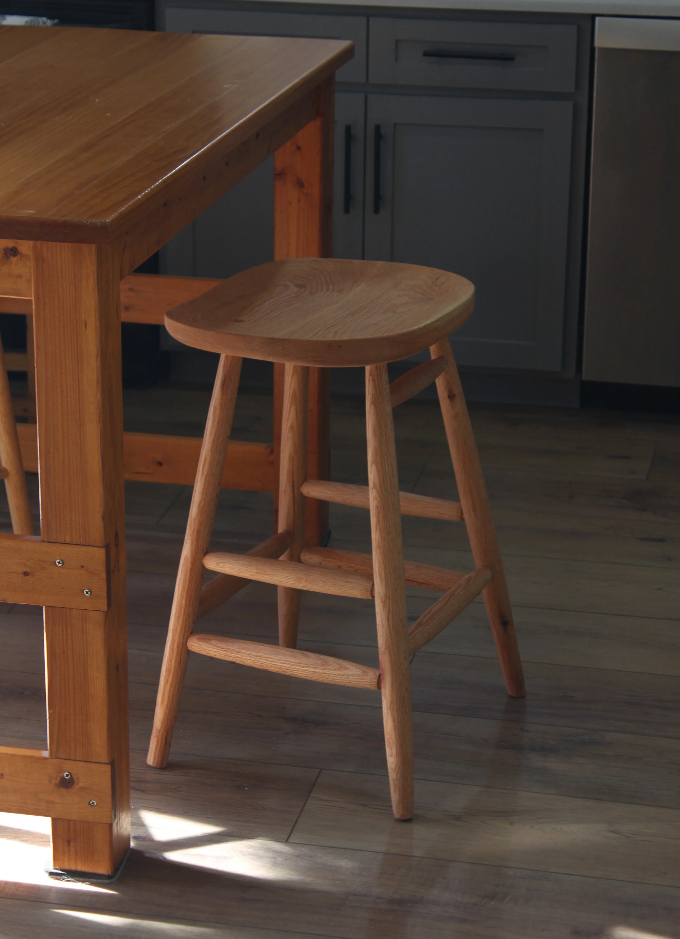 The 11 legs and rungs were done using a lathe. A relatively new process to me, turning was challenging to get the hang of, but a very fun process. Although several mess ups in the process made this challenging, these were produced quite fast. Finishing was done with a beeswax and orange oil mixture after the many steps of sanding. This would leave a semi gloss to near matte finish that brought out the warm colors of the red oak used.