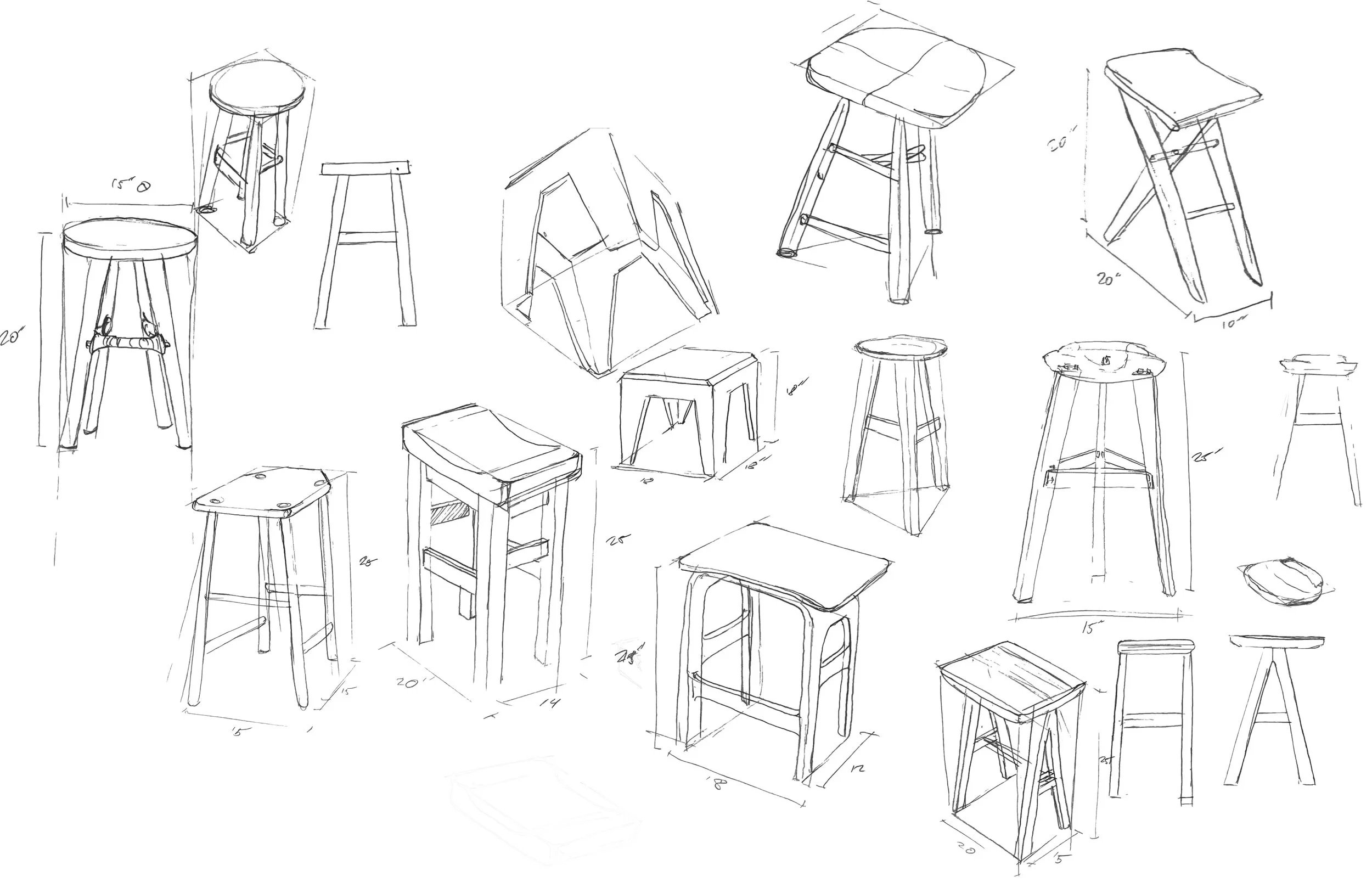 A series of sketches that would eventually to CAD modeling. These were iteration heavy following 3 main sub sets of furniture including post and slab, post and beam, and post and rung. I would then take the best out of these sketches and make CAD models based on them.